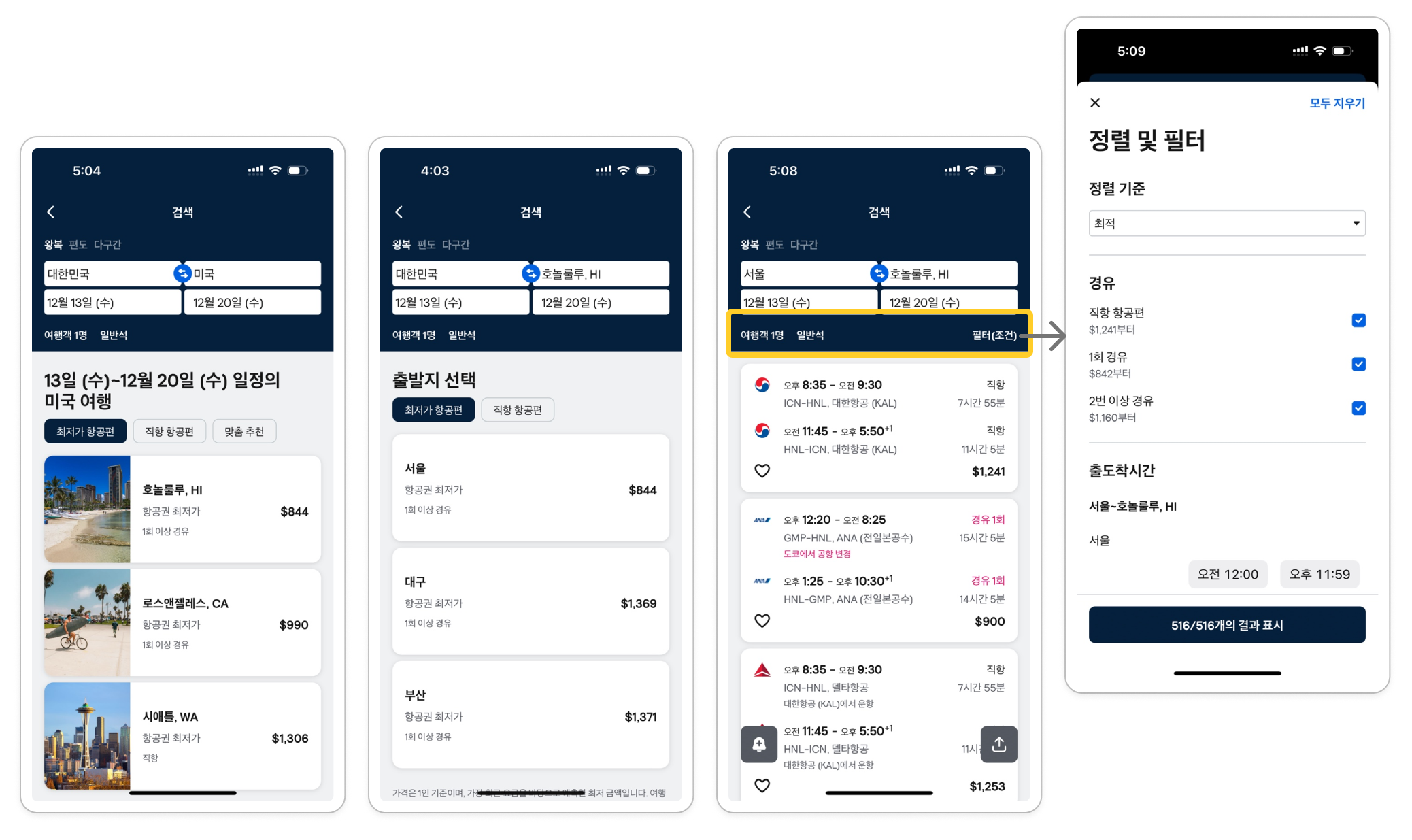 : 프로세스에 맞춰 출발지와 도착지를 모두 입력하면 항공사별 항공편의 일정을 보여준다. 디폴트가 “최적”값이기 때문에 가장 상단에 사람들이 선호하는 최저가+직항인 항공편을 볼 수 있도록 구성해 놓았다. 이때, 개인상황에 따라 필터(조건)를 통해 경유의 유무, 최저가, 출도착 시간 등을 조정하여 검색을 할 수 있도록 해놓았다.