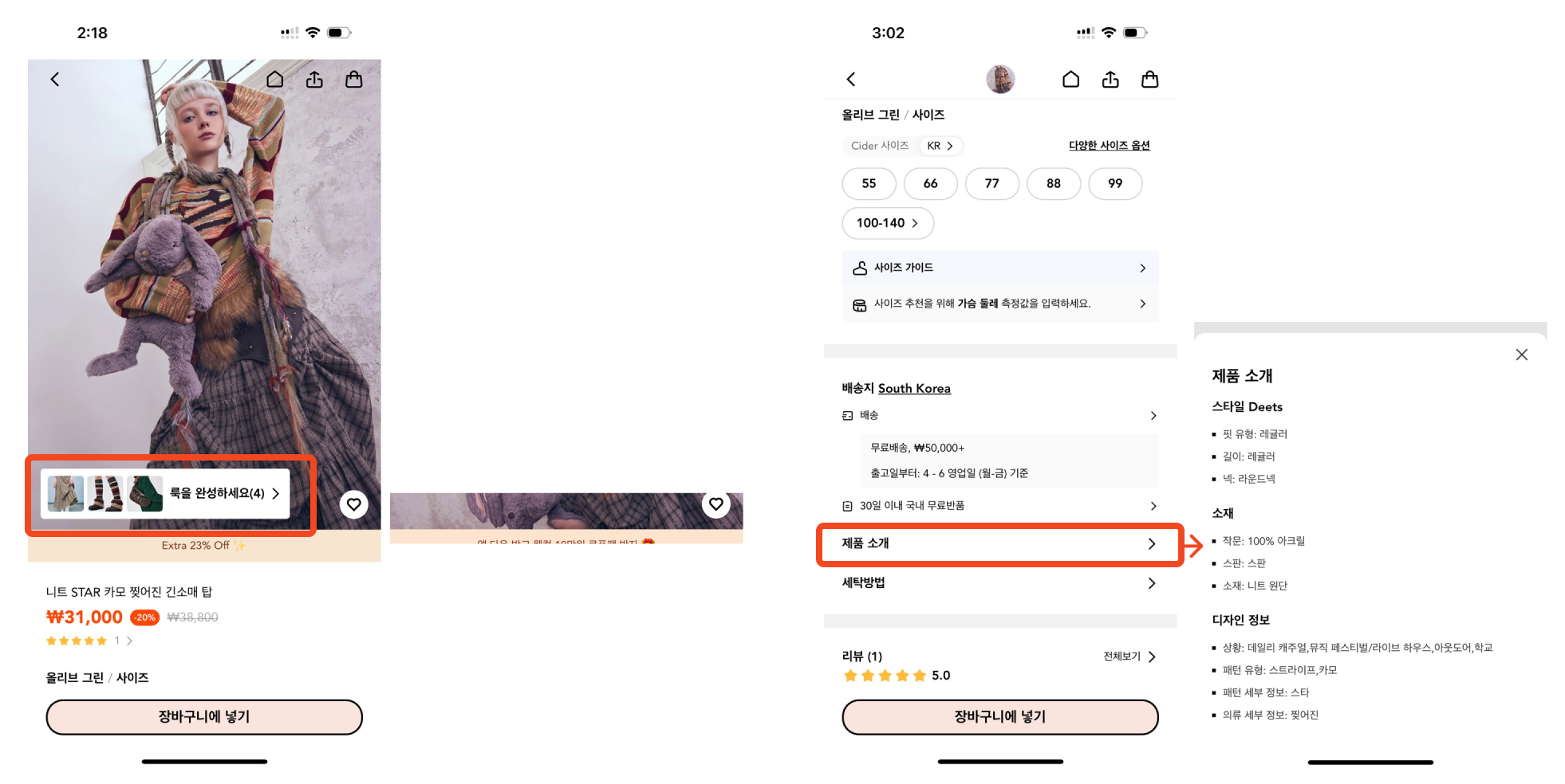: 상품을 구매하는 데 있어서 제품설명은 디테일하게 살펴보고 싶은 부분인데, 타 커머스와는 다르게 제품 설명을 바텀시트로만 간단하게 내용을 구성하고 있어 디자인이 독특하고 좋음에도 망설이게 만든다. 또한 제품소개 버튼이 배송지와 세탁방법 사이에 같은 폰트와 형식으로 들어가 있어 인지하지 못하고 넘어갈 수 있는 부분이 될 것 같다.