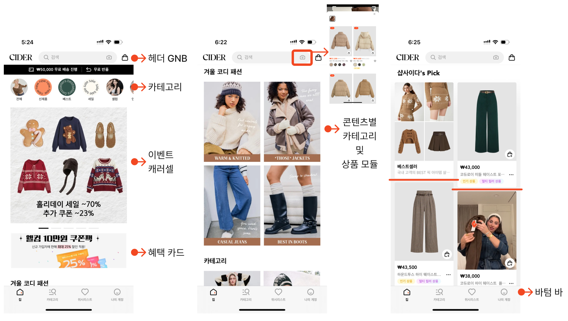 홈(집) 페이지는 헤더, 카테고리, 이벤트 캐러셀, 혜택 카드, 콘텐츠별 카테고리 및 상품 모듈, 바텀 바로 구성하고 있다.