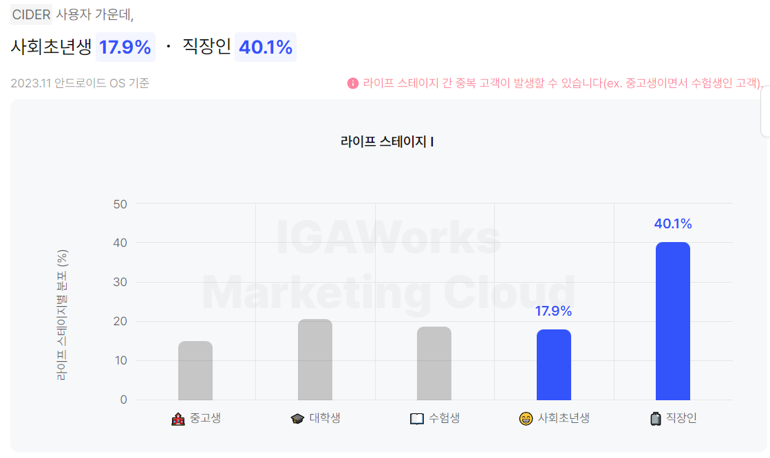 주로 여성 의류에 힘을 주고 있어 여성 사용자가 남성보다 많은 것을 볼 수 있고, 다양한 연령층에서 사용하고 있지만 특히 MZ를 공략하는 트렌드를 제공함으로써 표와 같이 20대에서 가장 많은 사용자가 분포하고 있다는 것을 볼 수 있다. 또한 경제적으로 많은 소비를 하기 어려운 10대 또한 비슷한 여성의류 앱들 중에서는 높은 사용자 비율을 가지고 있다.