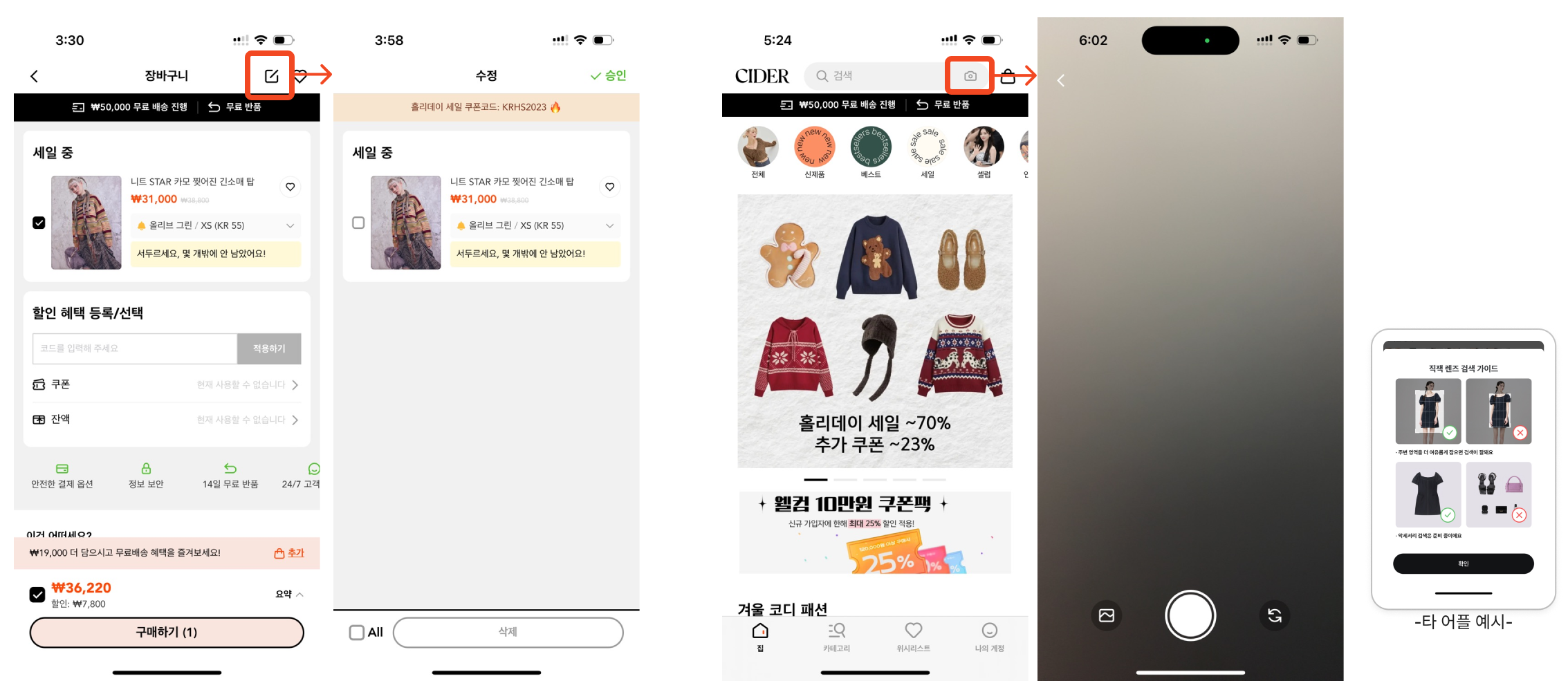 : 장바구니 페이지의 오른쪽 상단에 편집 버튼을 구성하였는데 편집버튼이 장바구니에서 보기에 익숙하지 않아 어떤 아이콘인지 바로 알지 못할 수 있다. 또한 메인 장바구니 페이지와 다른 부분은 장바구니에 담은 상품들만 볼 수 있다는 것과 전체선택이 가능하다는 것뿐이기 때문에 편집 버튼을 제거하고 전체선택 버튼을 상단에 포함시키면 더 편하게 사용할 수 있을 것이다.