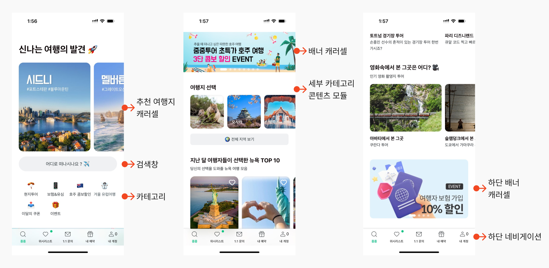 홈(줌줌) 페이지는 추천 여행지 캐러셀, 검색창, 카테고리, 배너, 세부 콘텐츠 모듈, 하단 배너, 하단 네비게이션으로 구성하고 있다.
