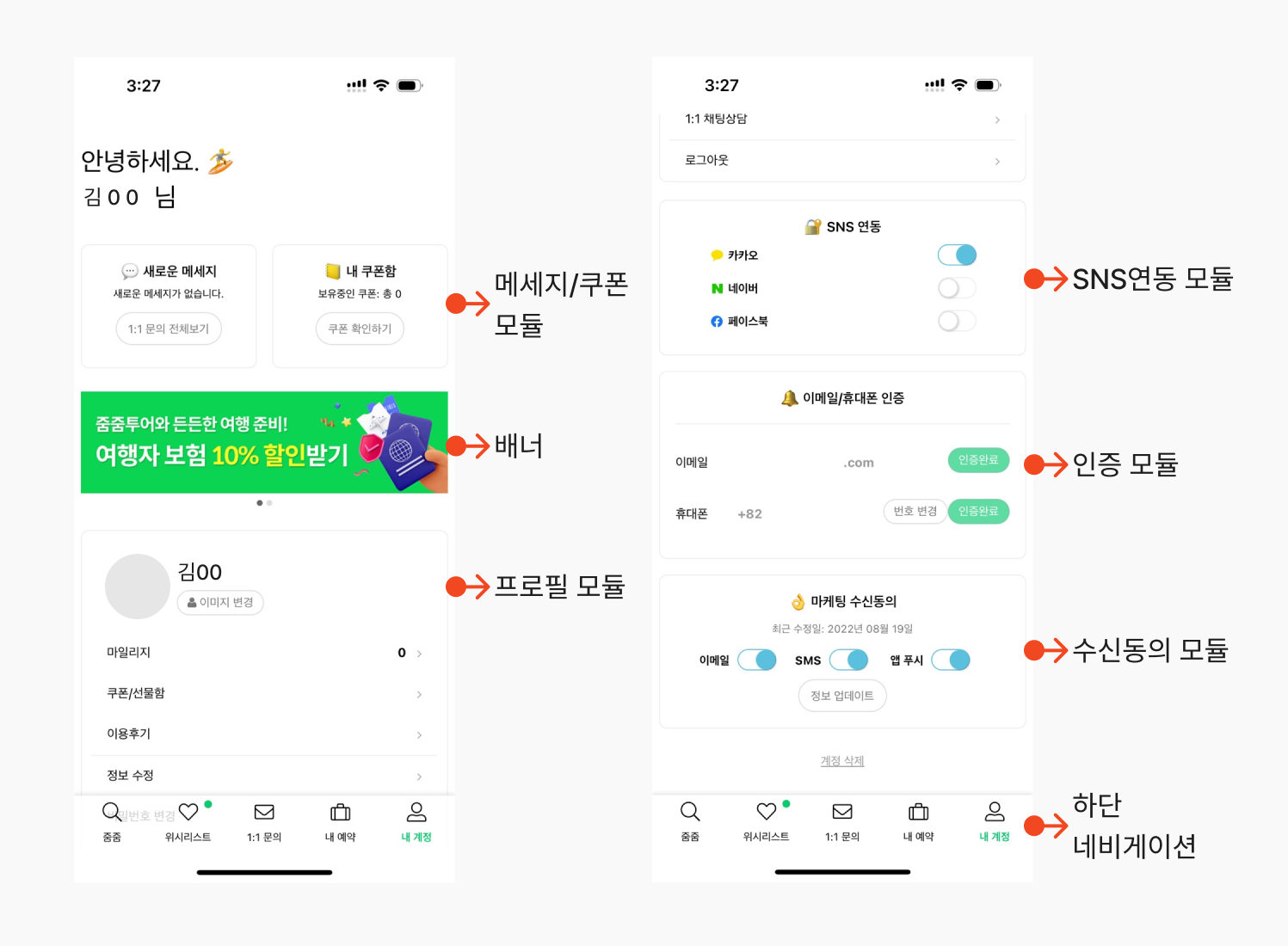 내 계정 페이지에서는 메세지 및 쿠폰 모듈, 배너, 프로필 및 기타 사항 모듈, 하단 네비게이션으로 구성하고 있다.