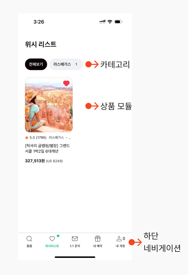 위시 리스트 페이지에는 카테고리, 상품모듈, 하단 네비게이션으로 구성하고 있다.
