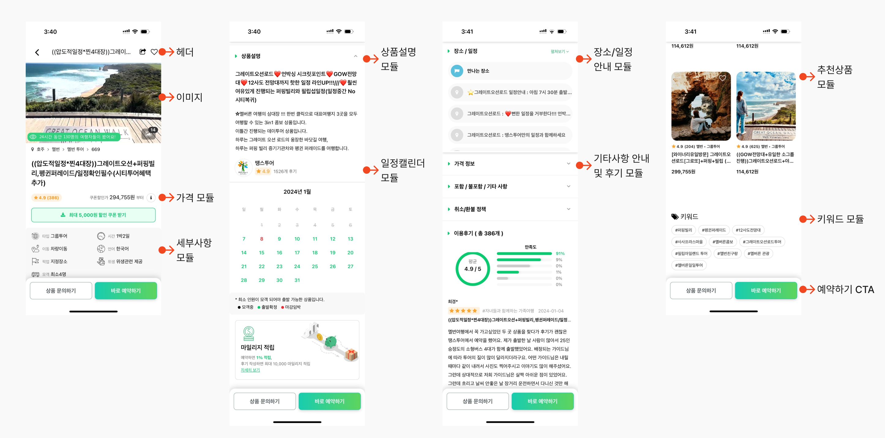 상품 상세 페이지에는 헤더, 이미지, 가격, 세부사항, 상품설명, 일정캘린더, 장소 일정, 기타사항 안내, 후기, 추천상품, 키워드 모듈, 예약 CTA로 구성하고 있다.