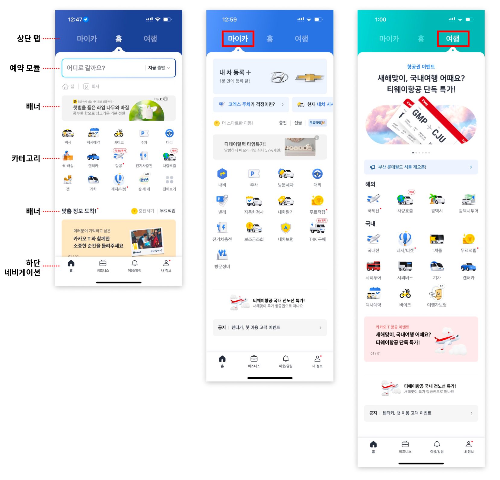 홈 페이지는 상단 탭, 예약 모듈, 배너, 세부 카테고리, 맞춤 정보 배너로 구성하고 있다.