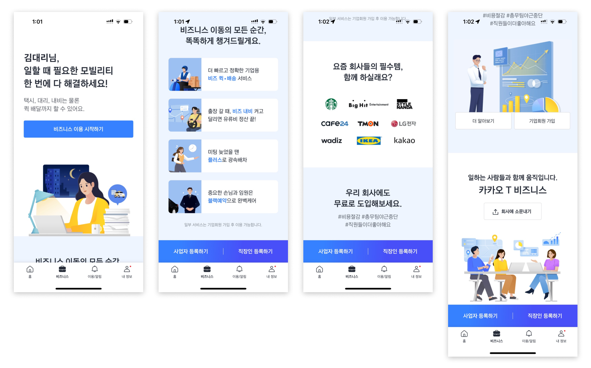 비즈니스 페이지에는 비즈니스 이용하기 버튼, 상세 설명, 사업자와 직장인 등록하기 버튼 등으로 구성하고 있다.