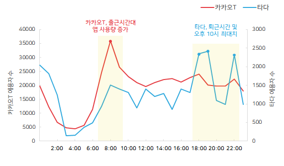 카카오 T 앱은 20~30대 사이에서 가장 많이 이용하고 있는 것으로 보이며 남, 여 비율이 비슷하지만 여성보다 남성이 더 많은 이용 비율을 보이고 있다. 또한 출근시간대와와 퇴근시간대 이후에서 평균보다 많은 이용을 하는 것을 볼 수 있다.