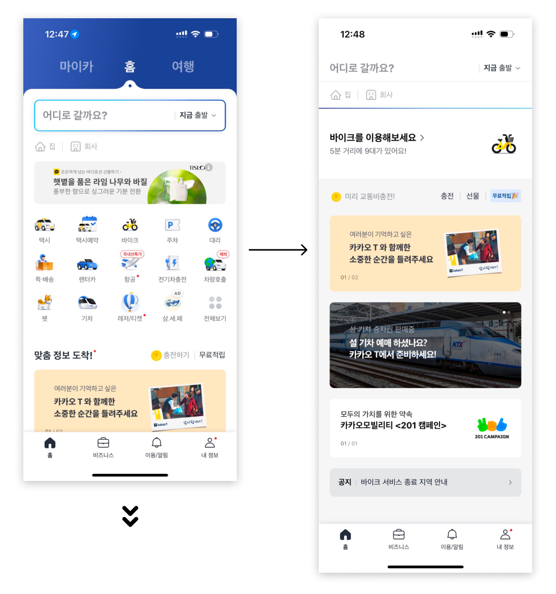 홈 화면에서 아래로 스크롤을 하게 되면 자연스럽게 화면이 스크롤되는 게 아니라 다른 화면으로 바뀌듯이 옆 페이지처럼 확 바뀌어서 오류가 있나, 다른 페이지로 옮겨간 건가 하는 생각이 들게 만든다. 맞춤 정보 배너를 첫 화면에서 잘리게 보여주었으니 아래로 스크롤을 하면 "어디로 갈까요?" 박스가 상단으로 고정이 되고 아래 모듈들은 자연스럽게 스크롤되어 페이지를 보여주면 더 좋을 것 같다.