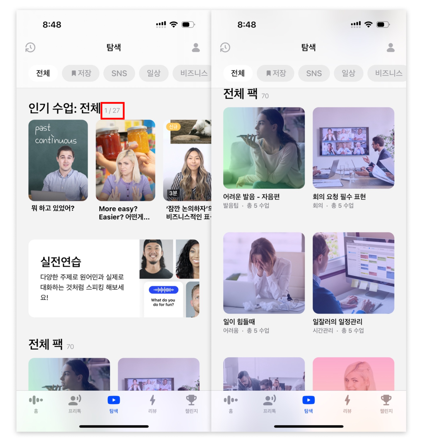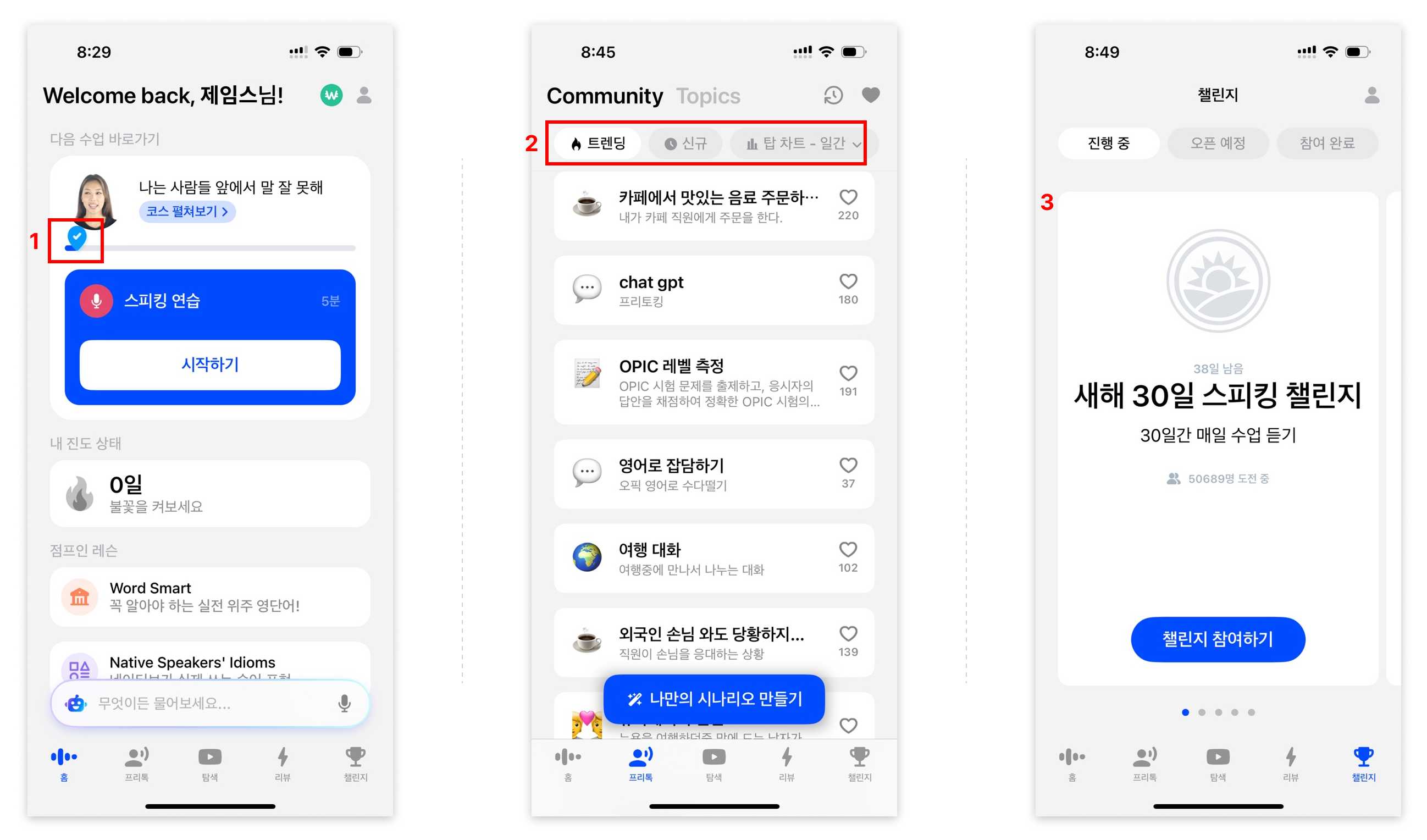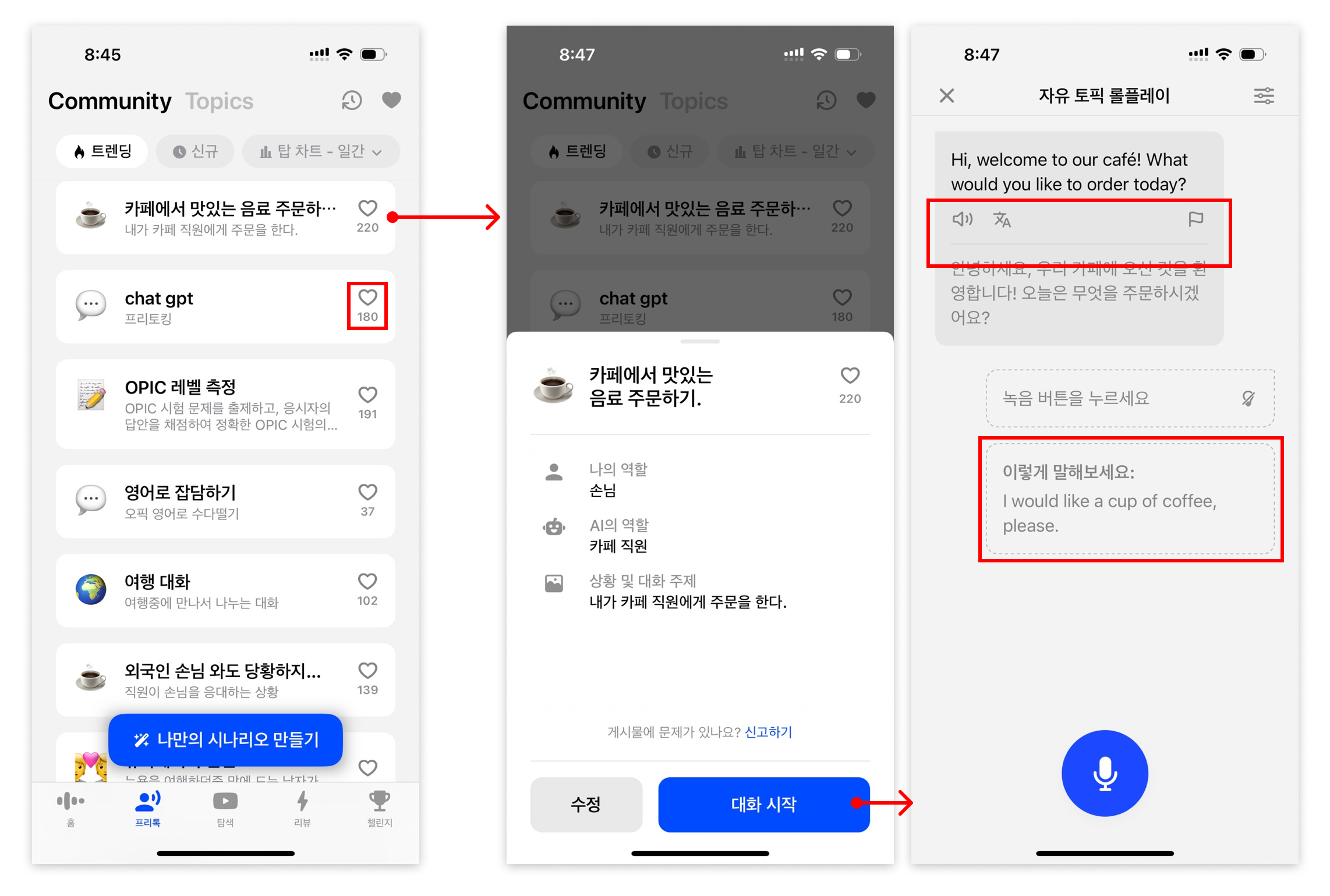 프리톡 페이지는 토픽에 따른 모듈들로 구성하고 있다. 하나의 토픽을 선택하면 시작하기 팝업창이 뜨고, 시작을 누르면 해당 토픽의 대화가 시작된다.