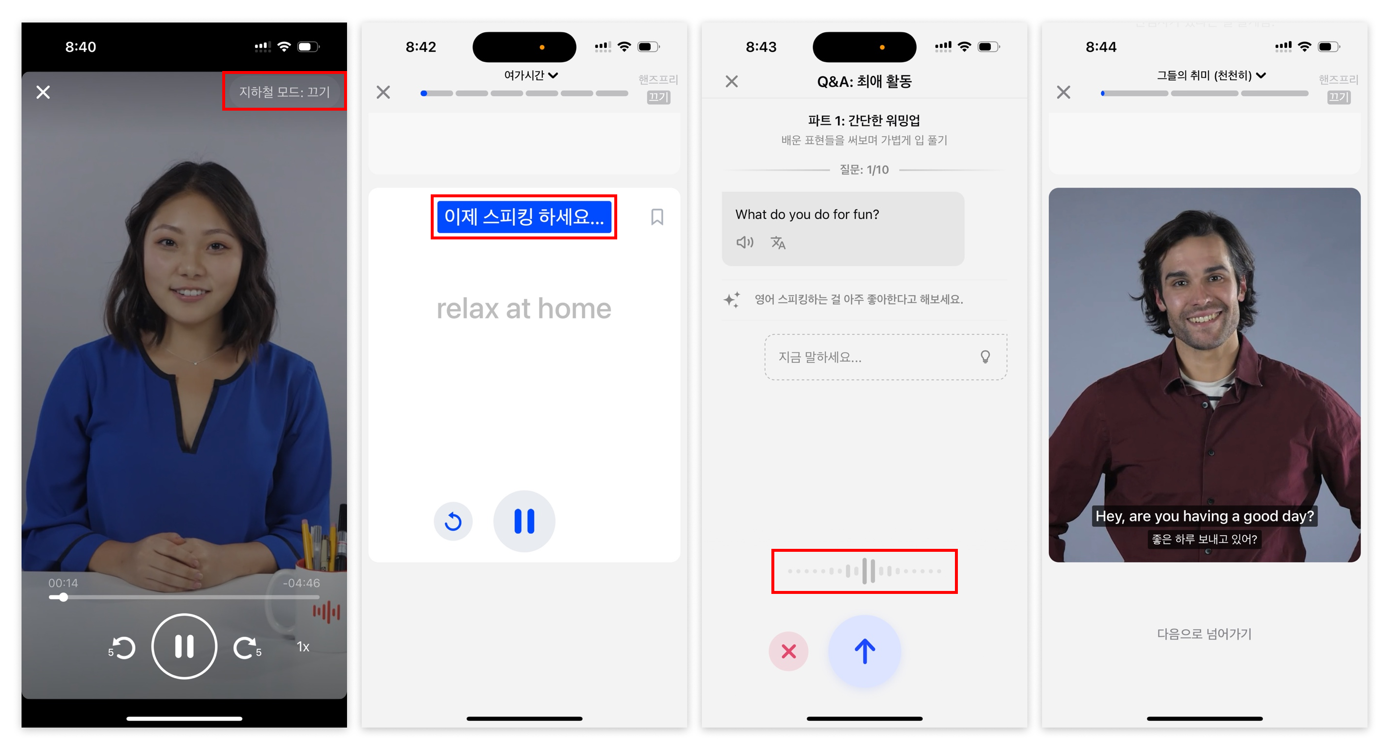 - 음성 인식이 진행되는 중에 잘 인식이 되고 있는지는 문장의 색상 변경 혹은 상단에 "이제 스피킹 하세요"라는 문구를 띄워 알려준다. 또한 애니메이션 효과를 주어 음성 데시벨에 따라 움직이는 것을 보며 사용자 본인이 잘하고 있는지 스스로 파악할 수 있게 한다.
