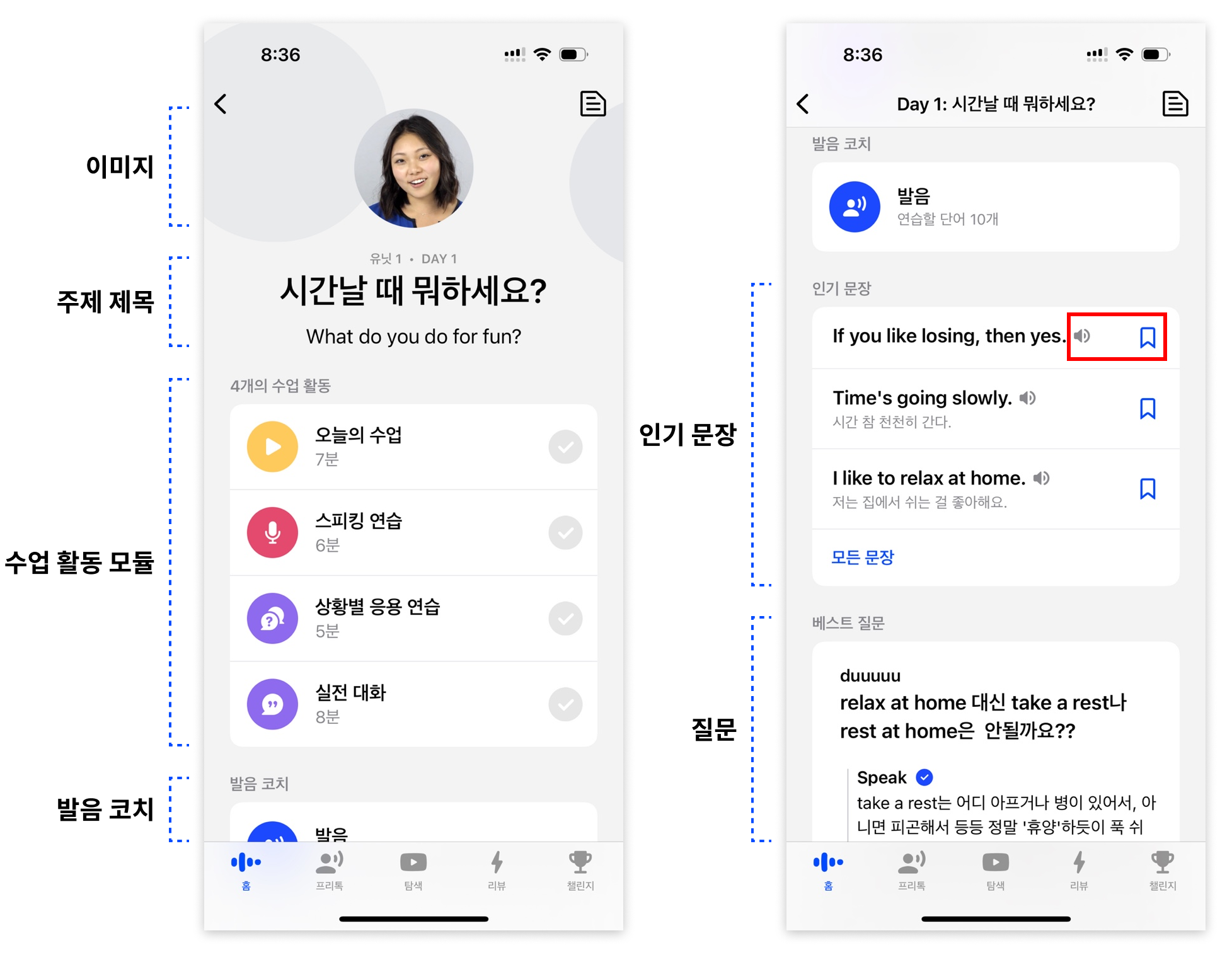 상세 페이지는 진행 강사 이미지, 주제 제목, 수업 활동 모듈, 발음 코치, 인기 문장, 베스트 질문으로 구성하고 있다.