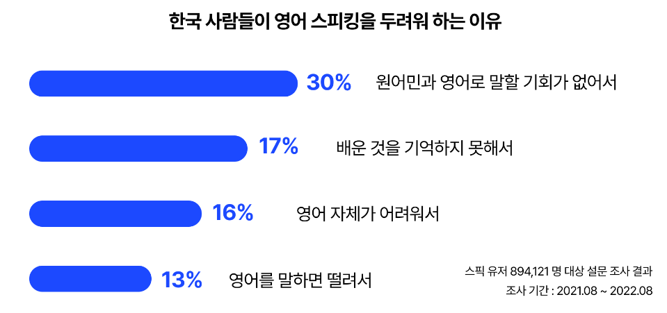 스픽에서 진행한 설문조사 결과 사람들이 영어 스피킹을 두려워하는 이유에 원어민과 말할 기회가 없어서, 스피킹 자체가 어려워서, 틀리면 안 될 것 같은 압박감이 있어서 등이 높게 나왔으며 그러한 생각을 가진 사람들이 영어 스피킹을 더욱 편한 환경에서 늘리고자 스픽앱을 찾는 것으로 보인다. 이러한 생각을 가진 다양한 연령대의 사용자들이 사용을 하며 특히 직장인에서 많은 이용이 있는 것으로 보인다.