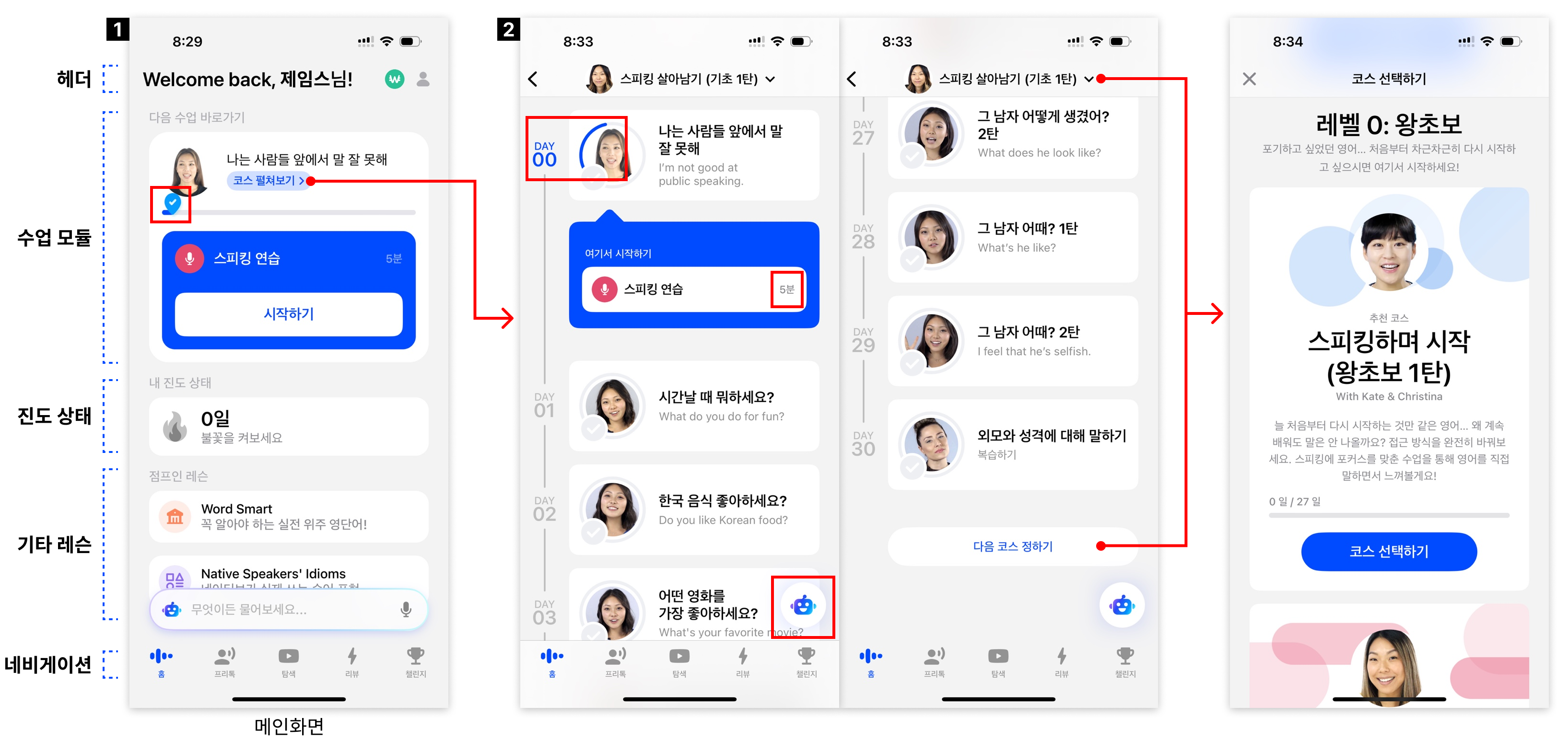 - 스피킹 연습 파란색 모듈 우측에 진행 시간을 표시하여 수업이 얼마나 진행될지 예상하고 시작할 수 있도록 도와준다.