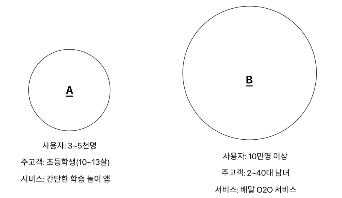 A 서비스와 B 서비스의 사용자, 주 고객, 서비스를 보아 각각 제품의 크기가 다르고 사용자의 경험 또한 다를 것으로 예상해 볼 수 있다.
