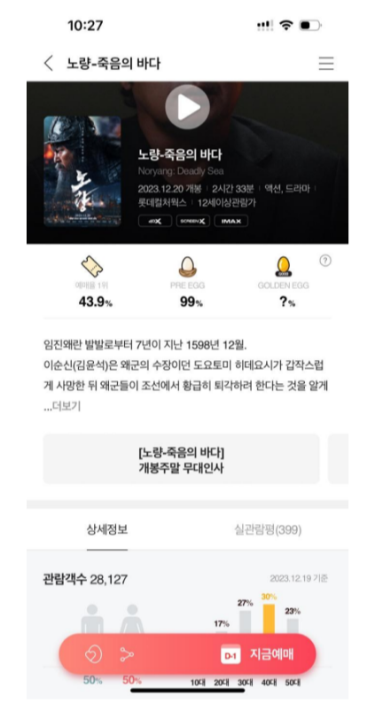 티켓을 예매하기에 앞서 영화에 대한 정보를 먼저 찾아보는 사람도 많을 것이다. 포스터를 클릭하면 해당 영화의 개봉일, 상영시간, 장르, 예매율, 줄거리, 관람객수, 관람평, 등장인물, 예고편, 포스터 스틸컷 등 확인해보고 싶은 정보를 한 페이지에서 다 확인해 볼 수 있도록 구성해 놓았다. 궁금해할 만한 사항들을 명확하고 쉽게 모두 제공해 줌으로써 사용자의 수고를 덜어주어 호감도를 높여줄 것으로 보인다.