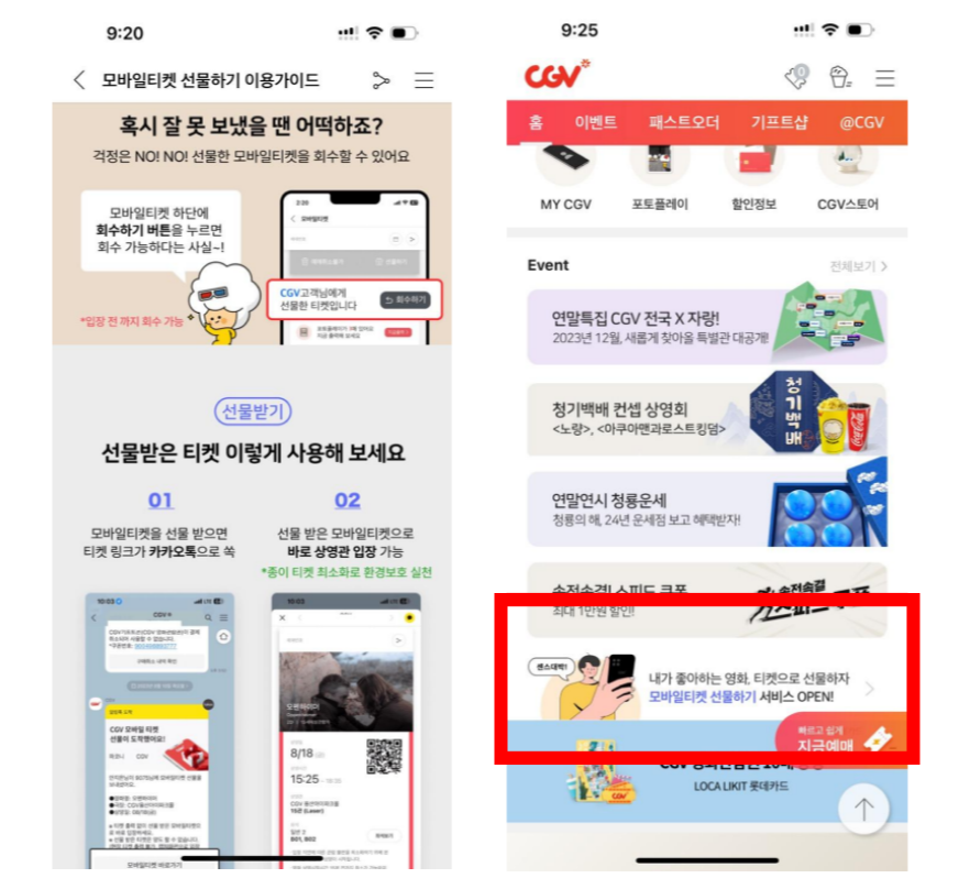 모바일 티켓 선물하기는 자주 이용하는 사용자가 아니라면 예매하기와 같이 여기로 들어가서 이렇게 하면 되겠다는 플로우가 머릿속으로 잘 그려지지 않을 수 있다. 그런 사람들을 위해 메인화면 중간에 모바일티켓 선물하기 이용가이드에 대한 카드를 위치해 놓았다. 어떻게 선물하는지, 선물 받은 티켓은 어떻게 활용하는지, 잘못 보냈을 때는 어떻게 해야 할지까지 간단하고 쉽게 설명해 두어서 경험이 없는 사람들도 사용법을 쉽게 이해하고 수행할 수 있을 것으로 보인다. 하지만 단점은 메인화면에서 찾아 들어갈 때 카드 내용이 “모바일티켓 선물하기 서비스 OPEN!”으로만 되어 있어서 이것이 이용가이드인지 모르고 못 찾을 수도 있겠다는 생각이 든다.