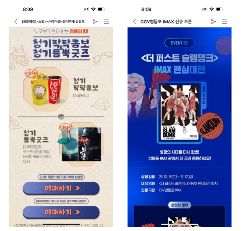CGV 앱에서 여러 가지 이벤트를 진행하고 있다. 다양한 영상과 포스터를 담고 있는 앱이라서 그런지 이벤트 페이지 하나하나의 디자인이 해당 내용과 어울리는 배경, 폰트 등으로 만들어졌다. 이런 점들이 시각적으로 보는 재미를 제공하고 있다고 느낀다.