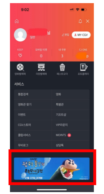 마이페이지에서 하단을 보면 상영하고 있거나 상영할 영화를 배너로 보여준다. 웹 사이트로 이동해서 해당 배너의 영화 정보들을 보여주는데 이는 모바일 앱에서도 충분히 확인할 수 있는 부분이고, 앱의 메인화면과 예약하는 과정에서도 원하면 바로 찾아볼 수 있다. 마이페이지에 광고를 넣어 꼭 보여줘야 할 부분이었을까? 사람들이 마이페이지에 위치한 이 배너를 많이 이용할까? 꼭 필요로 하는 부분은 아닐 것으로 보인다.