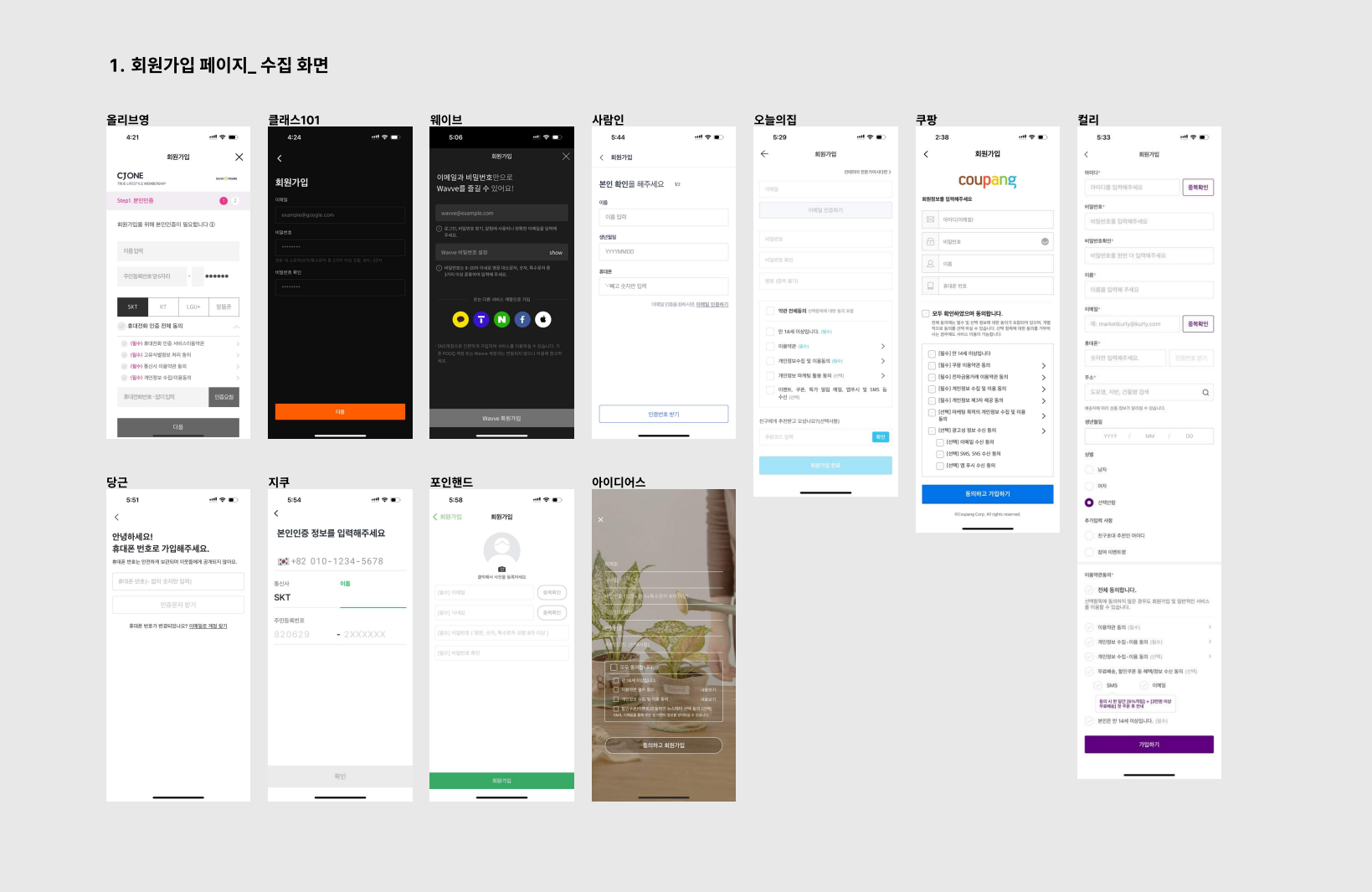1) 가장 많이 사용하는 앱의 회원가입 페이지 수집하기 (10개 이상)