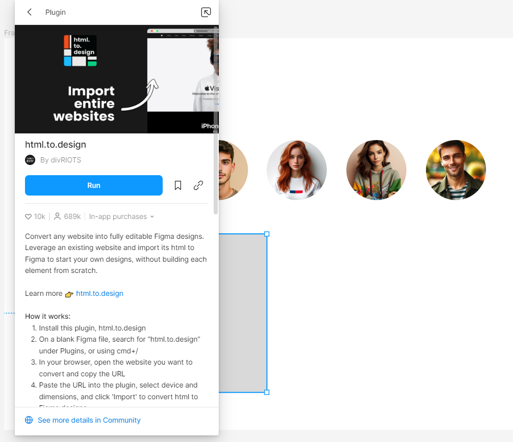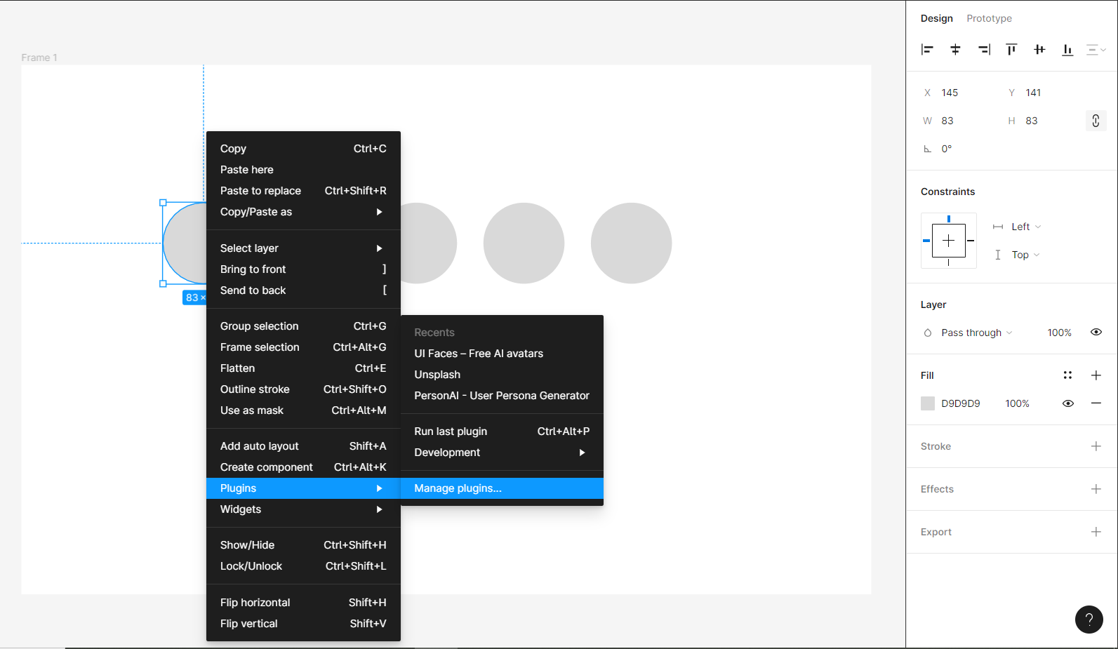피그마에서 마우스 오른쪽을 클릭하거나 상단에 리소스를 클릭하면 플러그인을 볼 수 있다.
