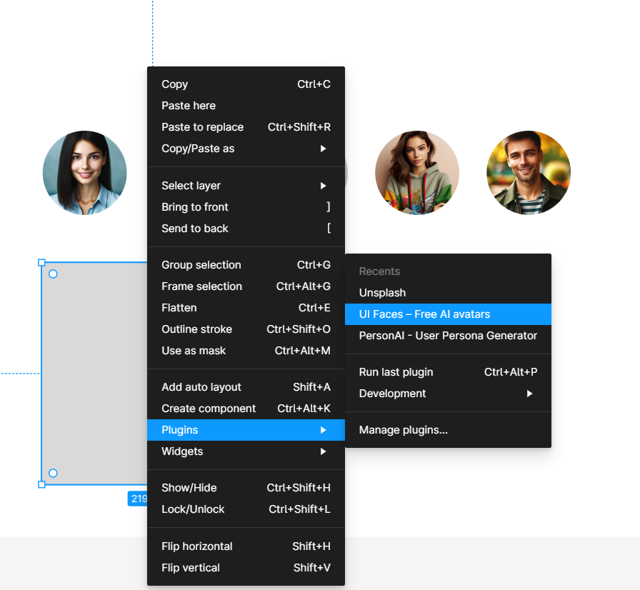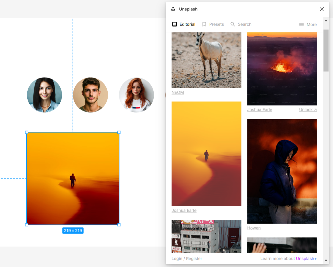 이번에는 다른 플로그인인 unsplash를 사용해 보았다. 사각형을 먼저 만들어주고 플러그인을 실행시켜 원하는 이미지를 선택해 주면 사각형에 맞게 잘 들어간 것을 볼 수 있다.