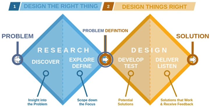 - 첫 번째 다이아몬드는 <맥락적 사용자 리서치>를 하며 관찰, 공감, 해석을 한다.
